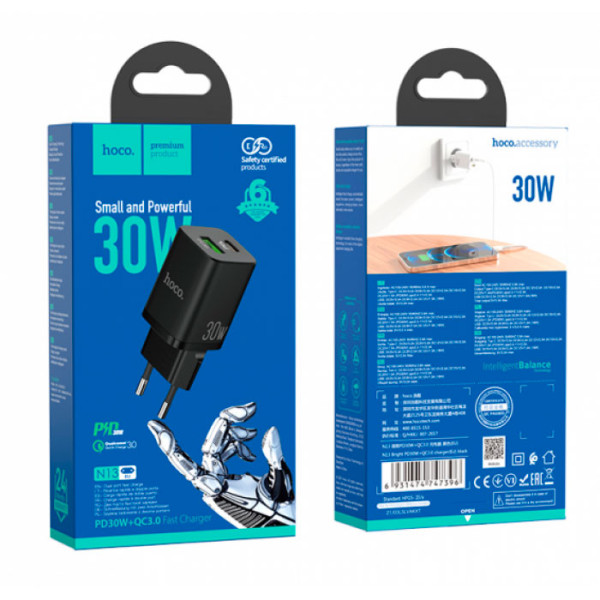 hoco. N13, зарядное устройство, выход Type-C PD 30W и USB-A QC 18W, EU штекер